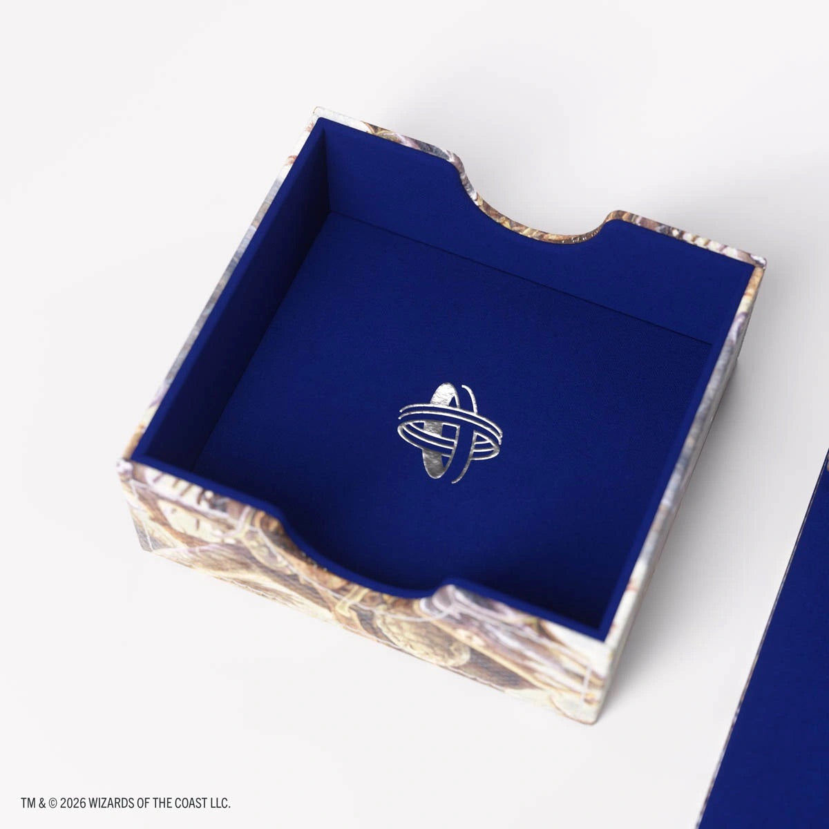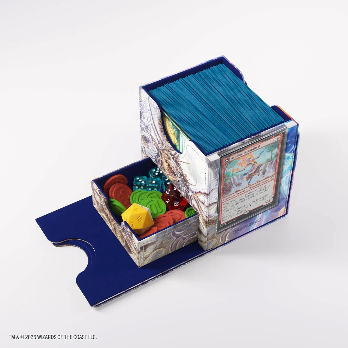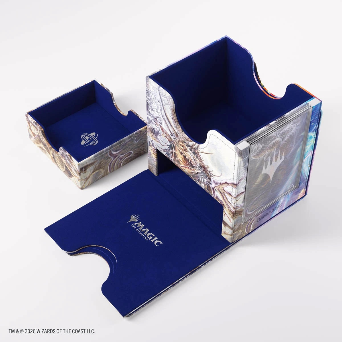 Designed for functionality and style, it holds 100+ double-sleeved cards in a sideloading position, with additional space for tokens and a UV-protected Slide Card Case at the front. The Slide Card Case is seamlessly integrated into the front of the box and can be removed for use during gameplay, allowing players to display their Commander card while keeping it fully protected at all times. A hidden, sturdy drawer provides extra storage for tokens or dice, ensuring all gaming essentials stay organized. The box fits 100 double-sleeved cards, even in extra Thick Inner Sleeves, or 100 regular double-sleeved cards with added room for token cards or Sideboard. Equipped with Gamegenic’s signature convertible system, the removable cover attaches to the bottom of the box, saving table space and providing effortless access to cards during play.